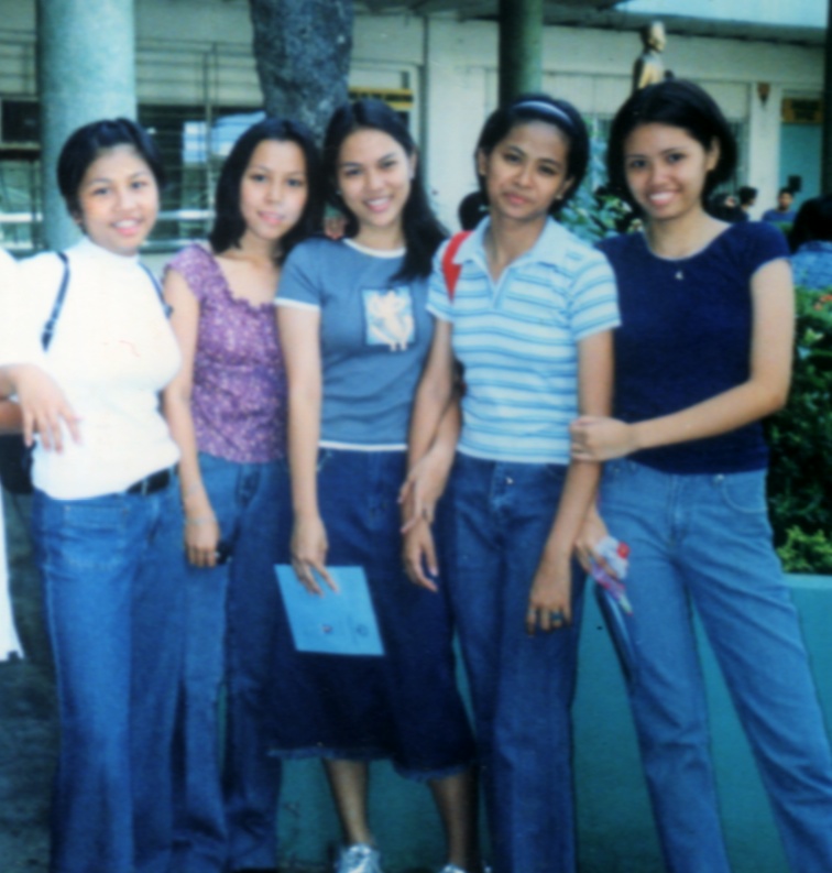 friends from highschool elle<white> cathy<purple> leni<blue> liza<stripes> and me |